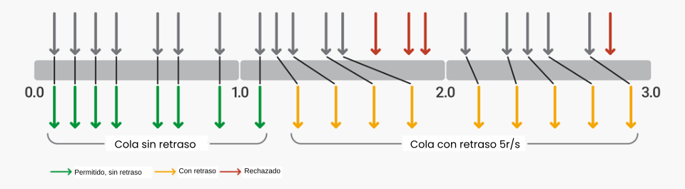 Las primeras 8 solicitudes (el valor del retraso) son proxy por Nginx Plus sin retraso. Las siguientes 4 solicitudes (ráfaga - retraso) se retrasan para que no se supere la tasa definida de 5 r/s. Las siguientes 3 solicitudes se rechazan porque se ha superado el tamaño total de la ráfaga. Las solicitudes posteriores se retrasan.